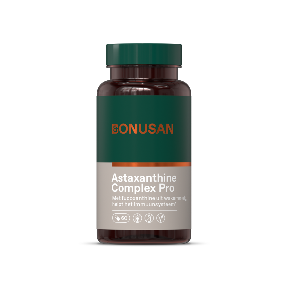 Bonusan Astaxanthine Complex Pro Capsules (60 stuks) is een uitgebalanceerde mix op basis van astaxanthine en fucoxanthine. Astaxanthine en fucoxanthine zijn carotenoïden die voorkomen in voedingsbronnen zoals zalm, krill en bruine zeewieren zoals wakame. Als het moeilijk is