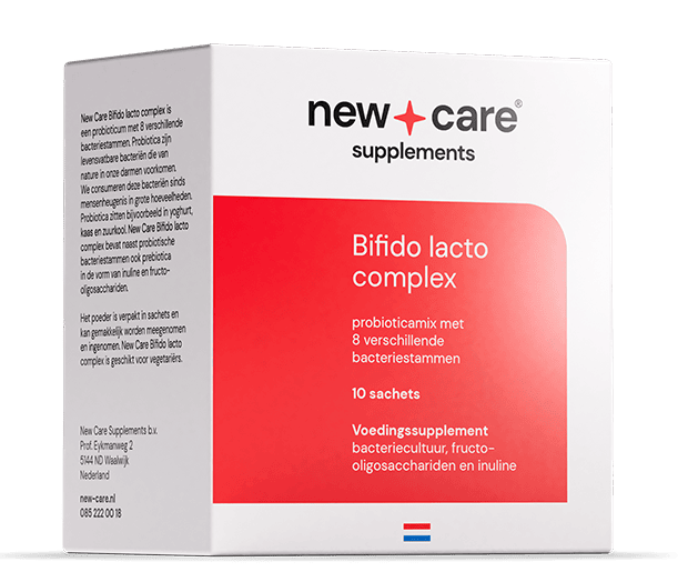 New Care Bifido Lacto Complex Sachets (10 stuks) is een probioticamix in poedervorm met 8 verschillende bacteriestammen, verpakt in handige sachets. Het bevat ook prebiotica (inuline en fructo-oligosachariden) en is geschikt voor zowel volwassenen als kinderen vanaf 2 jaar.